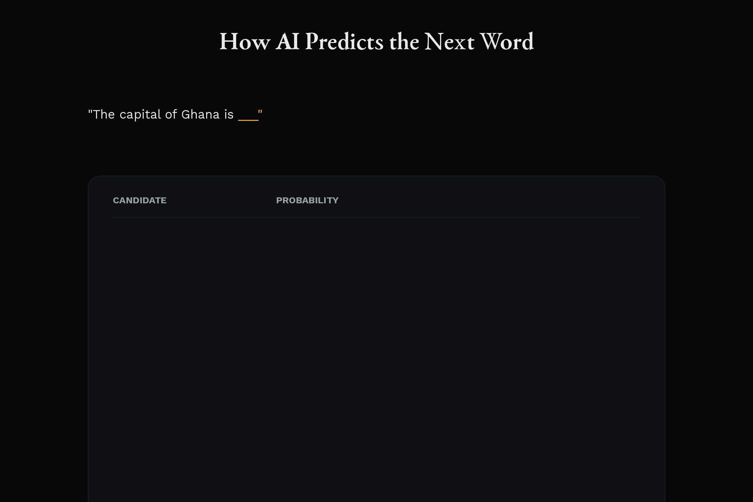 The key phrase is probability distribution. The model assigns a likelihood to every possible next word, then picks one. Sometimes it picks well. Sometimes it doesn't. But it never 'knows' what it's saying. There is no comprehension layer. No reasoning engine. No understanding. Some researchers have found that models build internal representations that look like more than surface-level pattern matching, and the debate is ongoing. But what you interact with when you type a prompt is, at its core, a prediction engine.